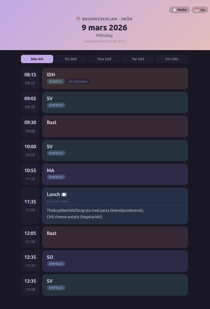 Som en liten bonus la jag in dagens skollunch också vilket hämtas från skolmaten.se och visar den i ett expanderbart kort i dagsvyn.