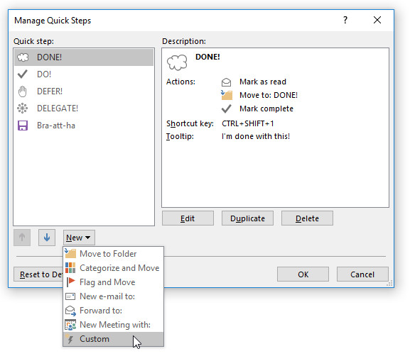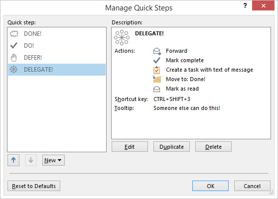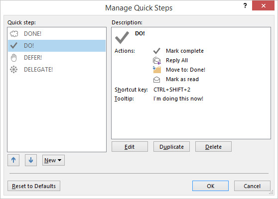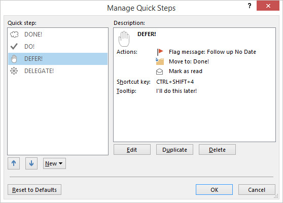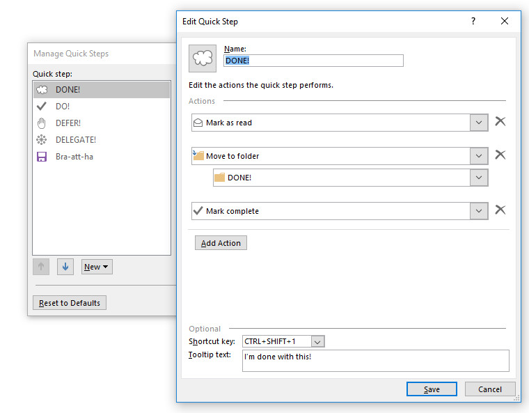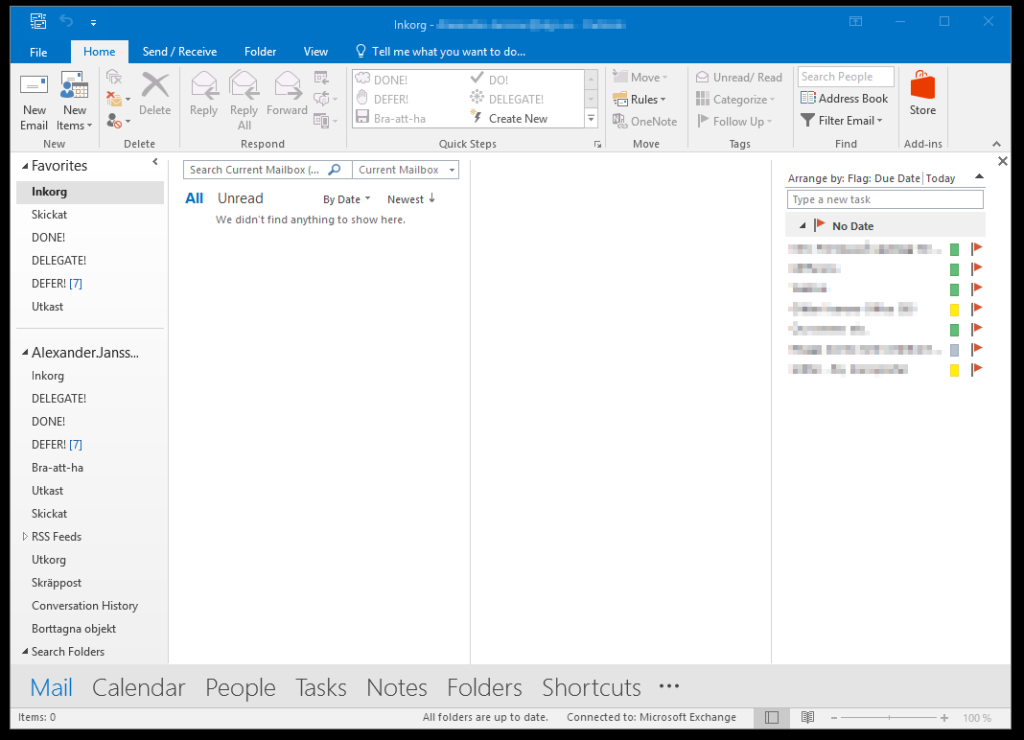 Den enda ändringen jag gjort från systemet ovan är att i genvägen Defer! flyttar jag mejlen till en mapp som heter DEFER! istället för Done. På så vis kan jag hålla koll på mejl jag behöver agera på utöver att bara se dem i uppgifter. Detta gör att jag även kan komma åt dem från mobilen eller andra enheter som inte stödjer Outlook Tasks.