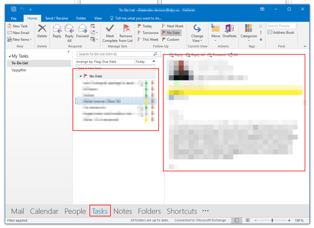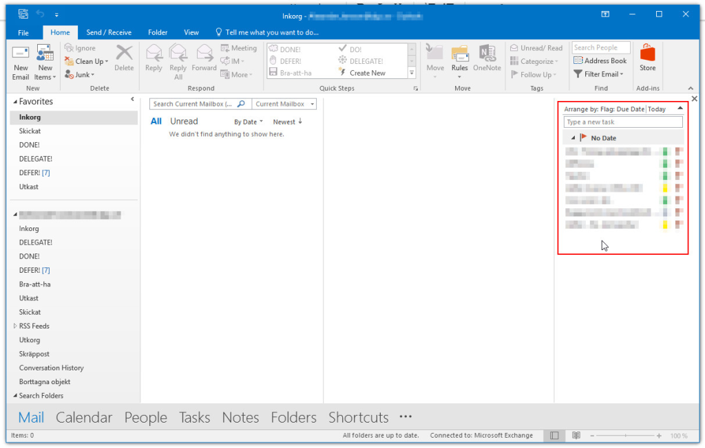 När du väljer Defer! flyttas mejlet till Done-mappen, men samtidigt skapas en uppgift i Outlook som väntar på att du tar tag i den. Detta är din startpunkt när inkorgen är tom eller när du har extra tid.